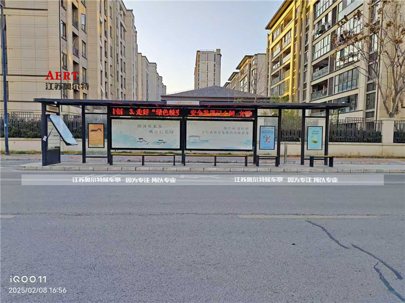 2. 材质与工艺:苏州智能候车亭主体多采用不锈钢、镀锌钢板等耐用材质,表面经静电喷塑处理,抗腐蚀、易维护,与图中候车亭的材质选用原则相同;顶棚常用钢化玻璃、PC耐力板,兼顾透光性与抗风性。