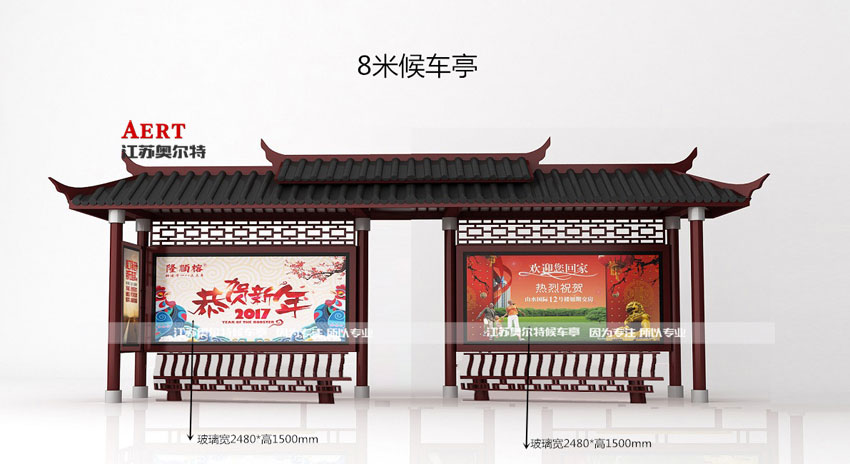 仿古款公交候车亭一般选用古铜色或者深咖啡色作为主色调,亭上装饰有镂空雕花的图案,顶棚则选用仿古瓦,箱体则选用常规的箱体制作工艺就可以。