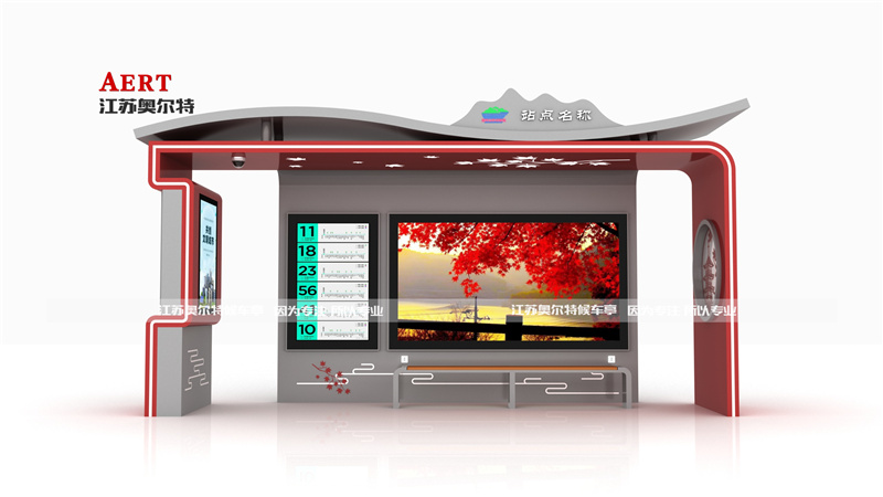 从设计元素看,候车亭以红叶为核心符号,正面的大幅红叶景观画面呼应了蛟河红叶谷的绝美秋色,顶部和立面的枫叶装饰细节进一步强化了这一主题。同时,融入了中式建筑风格,如右侧的亭阁剪纸元素、顶部的山峦造型,体现出蛟河的地域文化底蕴。