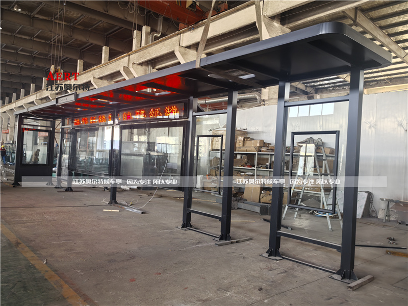 2. 材质与工艺:苏州智能候车亭主体多采用不锈钢、镀锌钢板等耐用材质,表面经静电喷塑处理,抗腐蚀、易维护,与图中候车亭的材质选用原则相同;顶棚常用钢化玻璃、PC耐力板,兼顾透光性与抗风性。